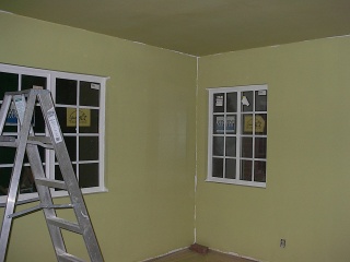 The paint doesn't show up as the right color on my laptop -- it's Glidden's "shakesphere" which is a sort of a sage green. Needed a second coat. The floor repair took days. Arrgh! Vacation is over. I go back to work tomorrow. Even taking the extra week was not enough.