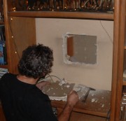 So, instead, I made it so I could slide the tv set back three inches. I measured and marked the wall that was obstructing the back of the set that enclosed the back end of the picture tube. Hammer and screwdriver to pound a square hole in the wall. (Luckily I happened between the joists, so I did not need to chisel out two inches from the three and a half inch depth of a joist. Which I would have as that joist is non-bearing wall and what load it does bear is vertical.)