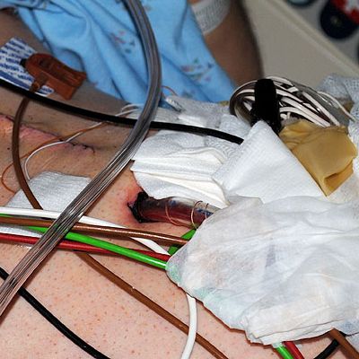 The thin red-white wires enter the body and attach to the heart, a temporary pacemaker, external. Second picture, a slightly different angle, shows the pacemaker itself, wrapped in gauze, a surgical glove or two, tape, the mass which is taped to the belly. Also visible is one of the two 1/2" diameter drainage tubes.