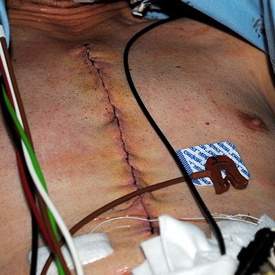 Getting a closer look at the surgeons' work... the classic "zipper" scar up the sternum, the thich red-green-brown-black-white wires run from the sticky pads to the ECG machine and monitor the electrical activity of my heart.