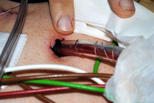 A nice picture of one of the two 1/2" drains removing excess fluid from the chest cavity. Was going good until the idiot nurse Cesar went and stepped on one of my tubes as I was getting up for a walk. I could feel air and fluid being pushed back into my chest. He laughed. That idiot added a few days to the time I was stuck connected to the suitcase and drainage tubes.