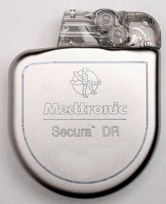 Medtronic Sprint Quattro, pictured left. This little toy is under a half inch in length and a tenth of an inch in diameter. It was inserted into a vein in the collar area, down into the heart, and embedded into the interior; dragging it's wires with it. Those wires were then connected to a Medtronic Secura VR, pictured right is the DR version, of lesser battery capacity. This thing is about 2" by 2" by 1/2" and is implanted under the skin near and below the left collarbone. The combination is refered to as an "Implantable Cardioverter Defibrillator."