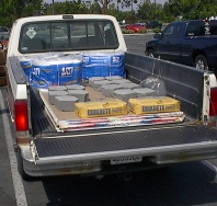 Today was shopping day. As noted yesterday, I needed to bring the drywall into the room before the window blocked my access. So I stop by the In-Laws to borrow the Pickup, hit the Home Depot, load six sheets of 5/8th inch gypsum board (fire rated!) two 60 pound bags of stucco mix, three rolls of R-13 insulation, and a baker's dozen keystone blocks (they go around the trees, another ongoing project.) Loaded all by myself onto the cart and all by myself onto the truck. Oy Vey! Building material is *heavy*