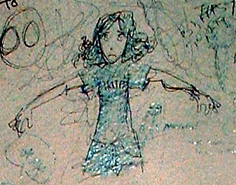 While working their room I notice that, as is common in kids' rooms, there is scribbling on the walls. There was the usual wide sweeps with the crayons done when they were toddlers. And then there was this. About four inches across. Done with what appears to be a fine point ballpoint pen.