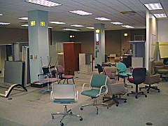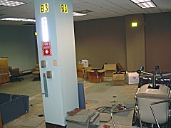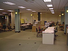 Total work done since the walkthrough -- Nothing. (Execpt my cleaning out the old 25-pair KTS cabling to make room for the cat-5.) First photos show cubicles that need to be removed. Third, squatters that need to move. Last three, real estate junk being stored has to go away. No one moves in until the desks and partitions are in. Desks and partitions await the electrician relocating power outlets and holes in the floor for the LAN cables. I need to run about 32 new sets of LAN cables and relocate 18 more -- to be done after the electricians have relocated power and holes, before the partitions get placed. Electricians can't do anything until real estate cleans up the old partitions and stuff and removes existing cubs.