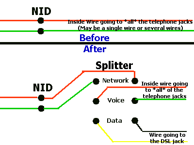 Start by checking that all of the telephones work. Taking a photo or making a drawing of what exists helps in case you need to undo your work. You then lift *all* the existing voice wiring off the NID and tie them down on the voice terminals of the splitter. Then you add a jumper from the NID (where you had lifted the above wired off) to the Network terminals of the splitter. At this point you have added the filter to your phoneline and all of the phones should still work. Go check *all* the phones. Fix any problems before preceding, or undo your work and come back here for help. Digital photos help. Assuming that all of the telephones work you may now tie down the wores going to your DSL jack onto the Data Terminals.