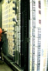 Show here are a COSMIC frame, and an older standard MDF (Main Distribution Frame). This is the vertical side, the VMDF, which traditionally has blocks terminating carrier bays and underground cables. The other side of the MDF is the HMDF, with the blocks mounted horizontally traditionally terminating the central office equipment. A medium size frame will have between 100,000 and 1,000,000 jumper wires running from one block to another to tie any piece of equipment to any cable pair or carrier channel. Or, in the case of DSL, from an equipment block supplying the dial tone, to a splitter block to add on the DSL signal, and then to a cable pair going out to the customer. No jumper is placed or removed without a service order. Every jumper is in a database. Without accurate record keeping it would be impossible to maintain the MDF.